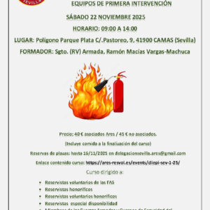 La Delegación de ARES en Sevilla Organiza la primera edición del «Curso de lucha contra incendios para Equipos de Primera Intervención.» El curso contempla el siguiente contenido, con una duración total de 5 horas lectivas. 1 sesión de formación consistente en una parte teórica y una parte práctica. 1 grupo limitado a un máximo 20 […]