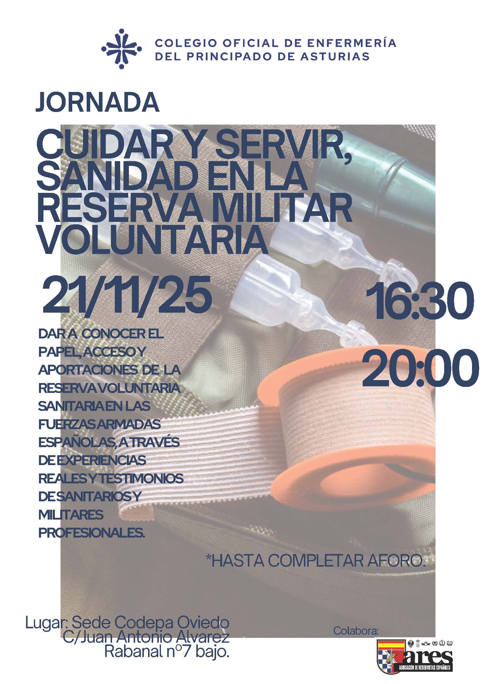 El próximo 21 de noviembre tendrá lugar de la «JORNADA CUIDAR Y SERVIR, SANIDAD EN LA RESERVA MILITAR VOLUNTARIA», organizada por el Colegio Oficial de Enfermería del Principado de Asturias, a través de la Teniente Enfermero CC (RH) Doña Esperanza Alonso Jiménez, Vice delegada de Ares en Asturias, con la colaboración de la Asociación ARES de Reservistas Españoles.