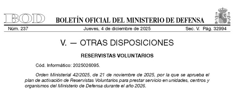 Publicada el 4 de diciembre de 2025 en el BOD la OM 42/2025 por la que se aprueba el plan de activación de Reservistas Voluntarios para prestar servicios en UCO,s durante el año 2026.